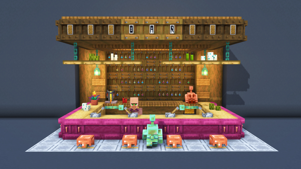 100%Interior Bar Decoration. The build features a wooden bar, shelves with bottles, candles, and warm lantern lighting. Please use the //paste -e command pasting the schem file to paste all the item frames and armor stands. This Minecraft build is free to download. You can find schem download for for this build.