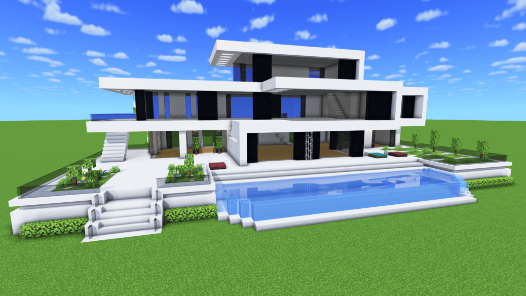 Modern house with large swimming pool. This Minecraft build is free to download. You can find .schem and world map download for this build.
