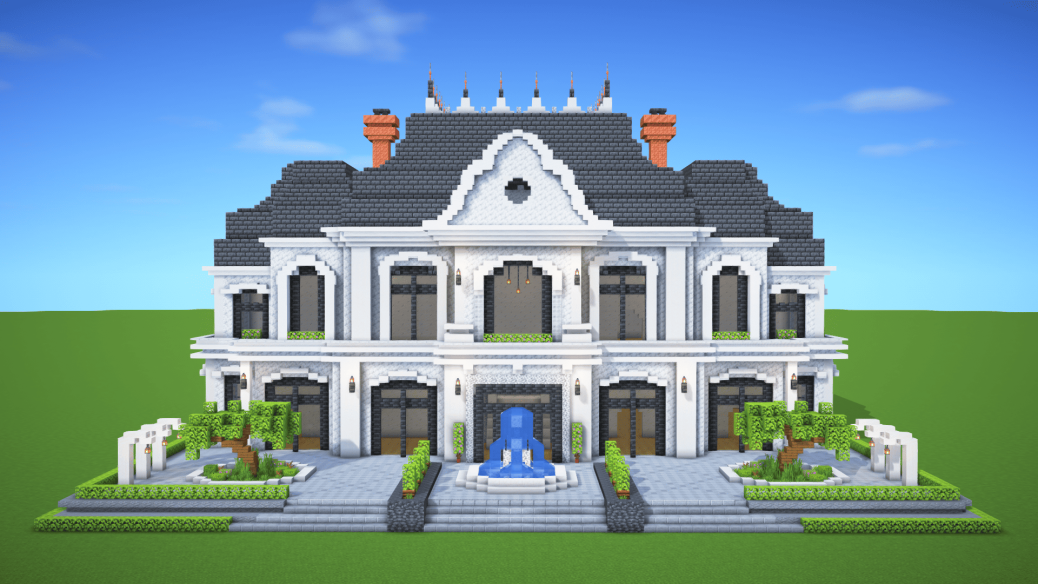 Large calcite mansion with a fountain and a terrace. You can download this Minecraft map for free. There are .schem and world map downloads for this build.