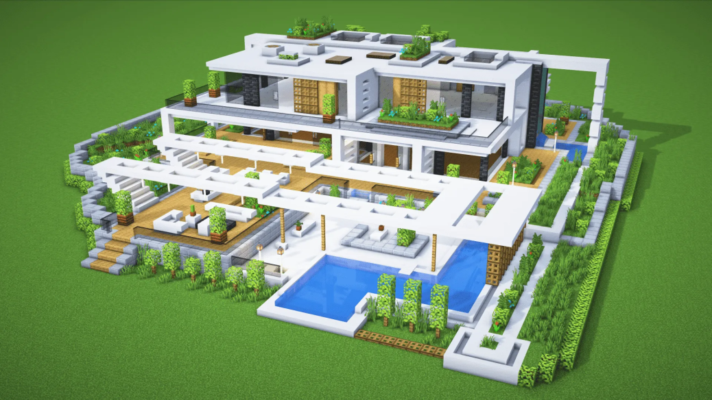 Modern house with a swimming pool and terrace. You can download this Minecraft map for free. There are .schem and world map downloads for this build.