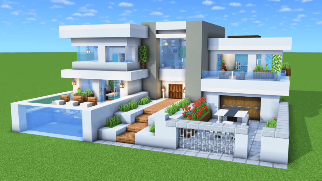 Modern house with interior and swimming pool. This Minecraft build is free to download. You can find .schem and world map download for this build.