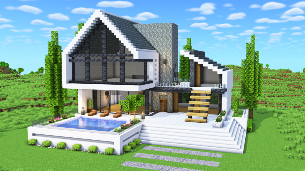 Large modern house with swimming pool and terraces. This Minecraft build is free to download. You can find .schem and world map download for this build.